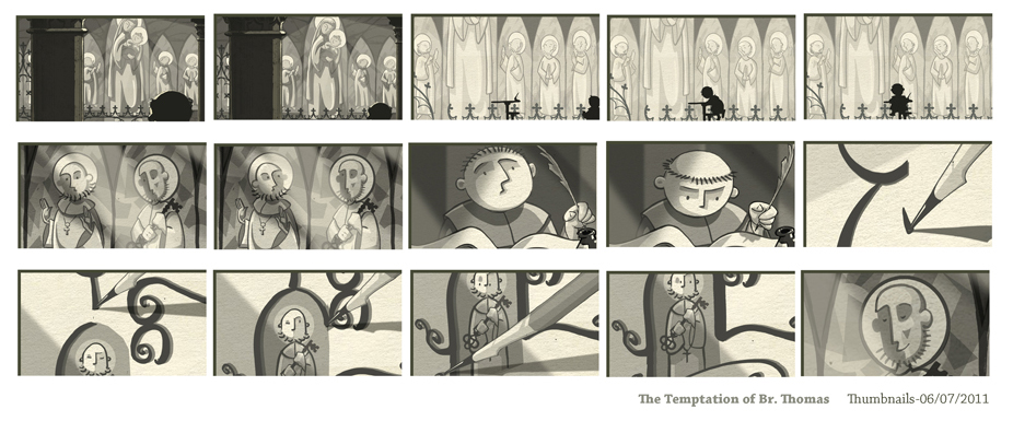 We will be using Storyboard Pro to format your final images and export final story panels to a Storyboard or Thumbnail sheet. SBP can export a variety of information such as shot numbering and duration, action and camera notes, and dialogue etc. For our purposes we will be exporting limited written information to allow more panels to be printed per page providing more of an overview of the storyreel. 30 panels per page to be exact.