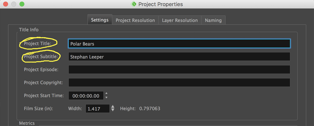 1. Complete Storyreel in Storyboard Pro, Name Project & Add Subtitle: To name your project and add a subtitle go to Storyboard/Preferences. . . in the top menu and name your project title and enter your name in the Project Subtitle.
