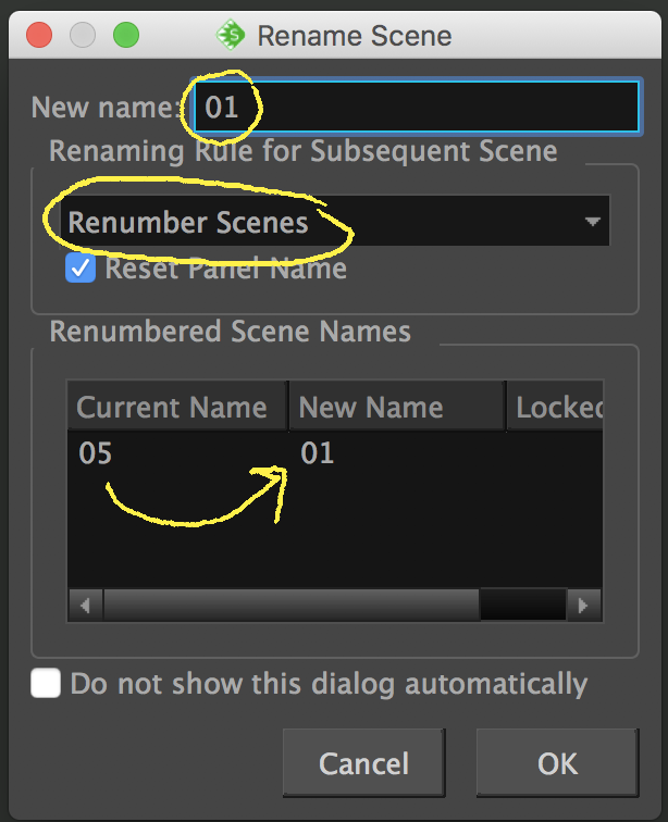 3. Rename/Number Scenes: Select the first Scene in the Timeline (or Thumbnail view) and go to the top Storyboard menu and select Rename Scene. Enter 01 in the "New name" window and select "Renumber scenes" from the drop-down. Notice that all your scenes will be renamed in the table below. Click OK.