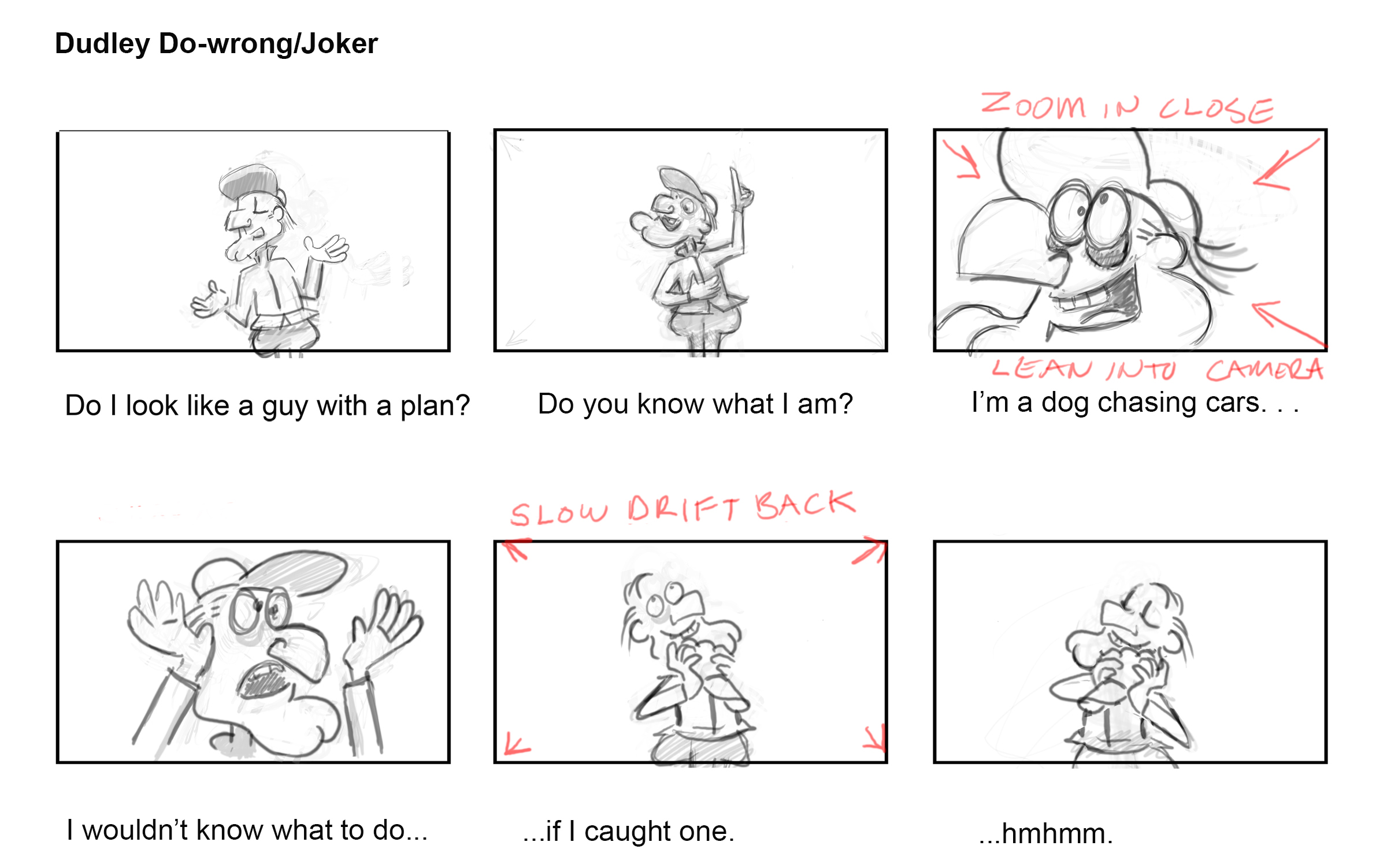 4. Draw a pose in each panel to express both the performance and the placement of the camera in proximity to the character. Work small and focus on gestures. Come back around and refine drawings when you feel all the panels are working together.